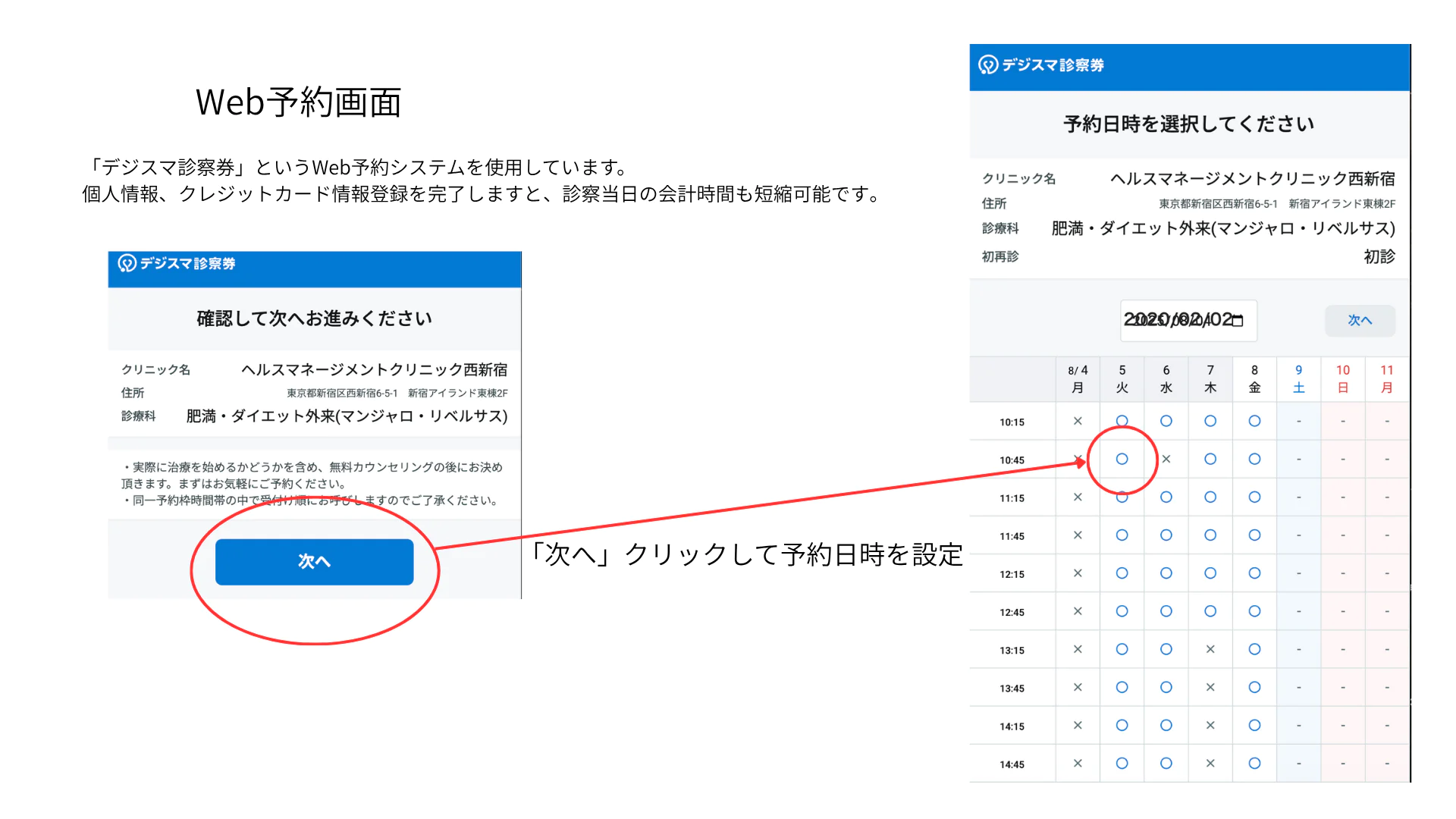 WEBまたはお電話でご予約ください。またその際、肥満外来の受診を希望する旨をお伝えください。