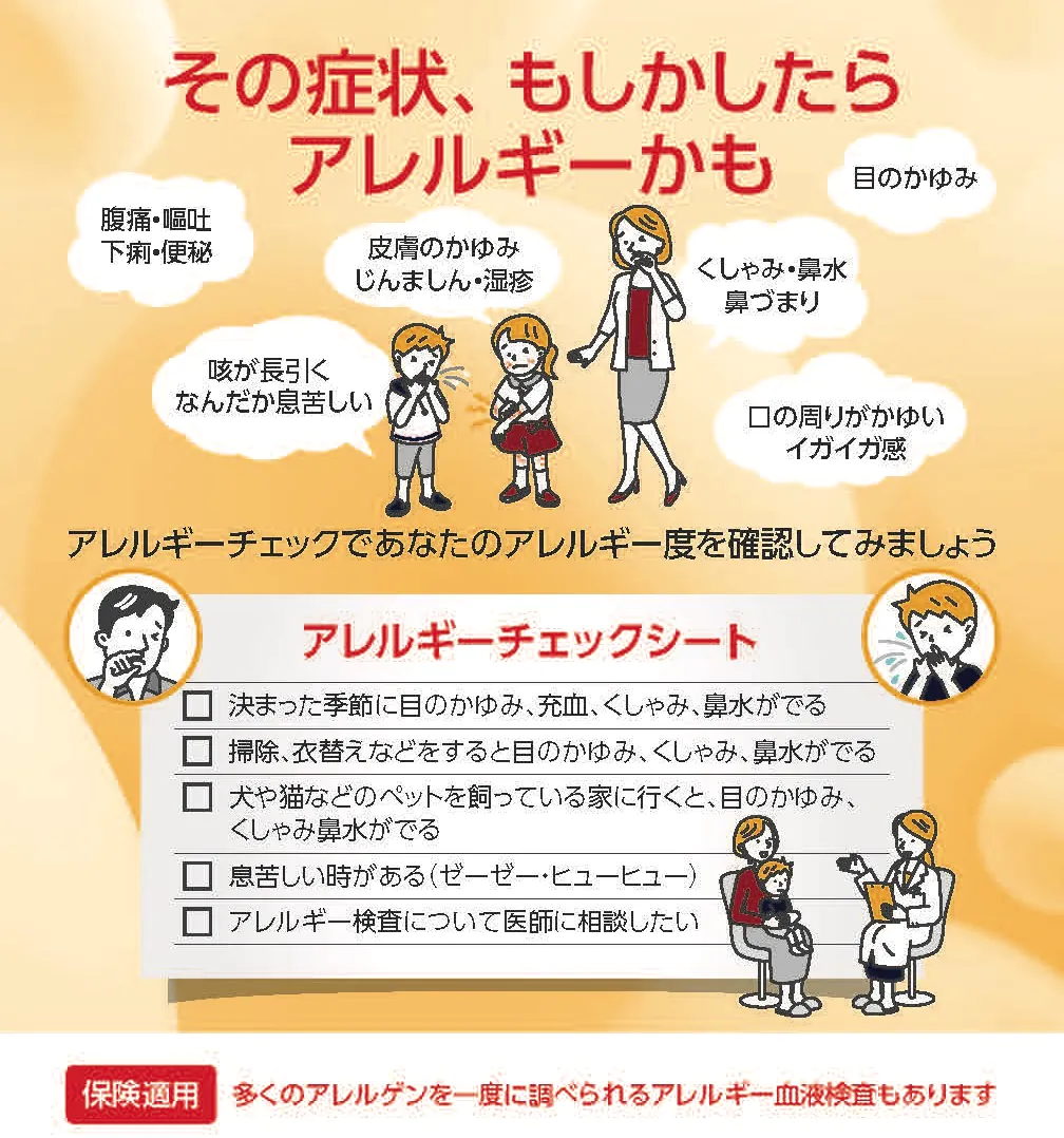 くしゃみ、かゆみ、皮膚の赤み、湿疹、じんましん(蕁麻疹)、のどや口まわりがイガイガする、長引く席、息苦しい、下痢・嘔吐、気分が悪い、ぼおっとするなどの症状があるといった場合は通常の保険診療として、アレルギー疾患の検査として実施可能です。