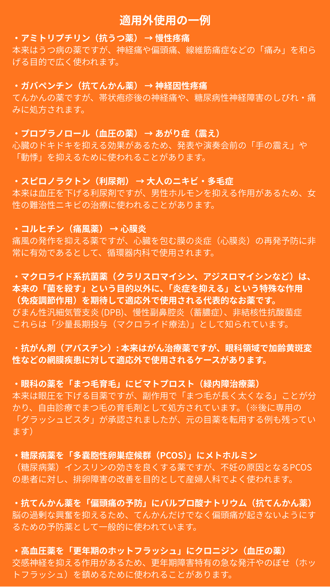 オレンジ色の図に、「適用外使用の一例」を並べてみました。私が経験しているものも、ChatGPTさんに聞いたものも挙げてみます(念の為、真偽は確認してくださいね。)