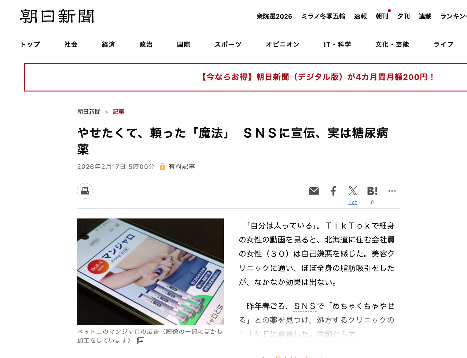 1)まず、糖尿病治療薬である「マンジャロ」を糖尿病以外に使用する「適用外使用」についてです。